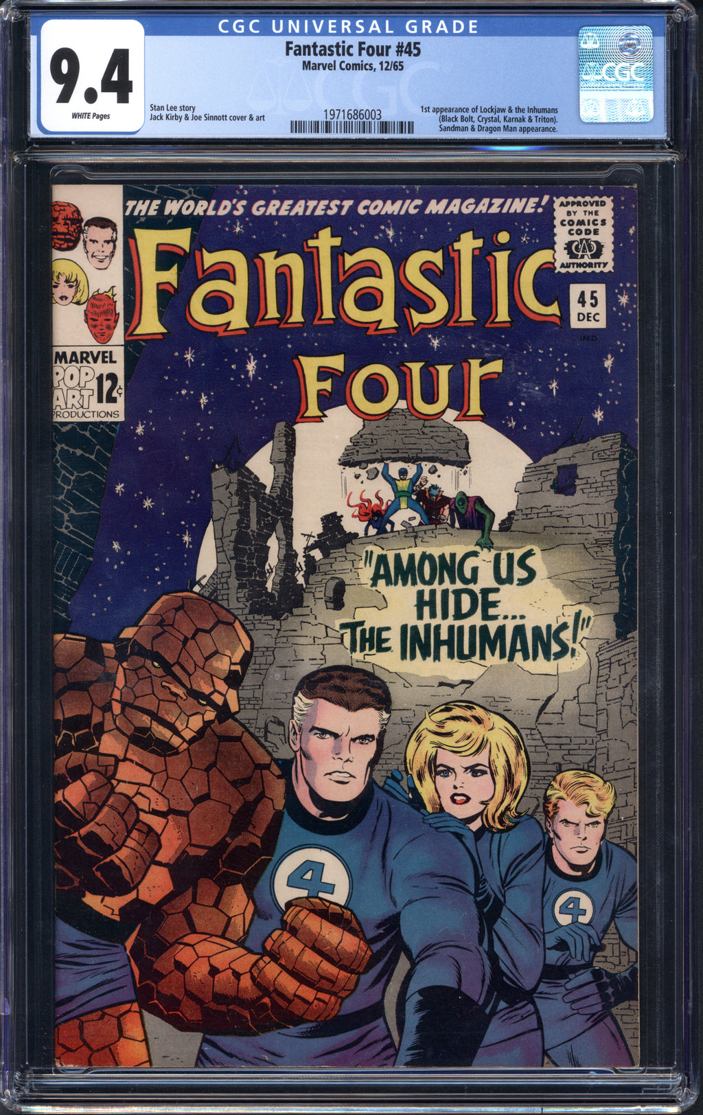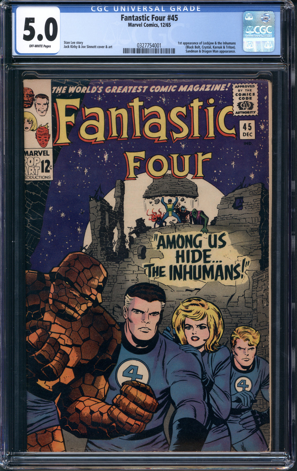 Notes: 1st appearance of Lockjaw & the Inhumans (Black Bolt, Crystal, Karnak & Triton). Sandman & Dragon Man appearance.